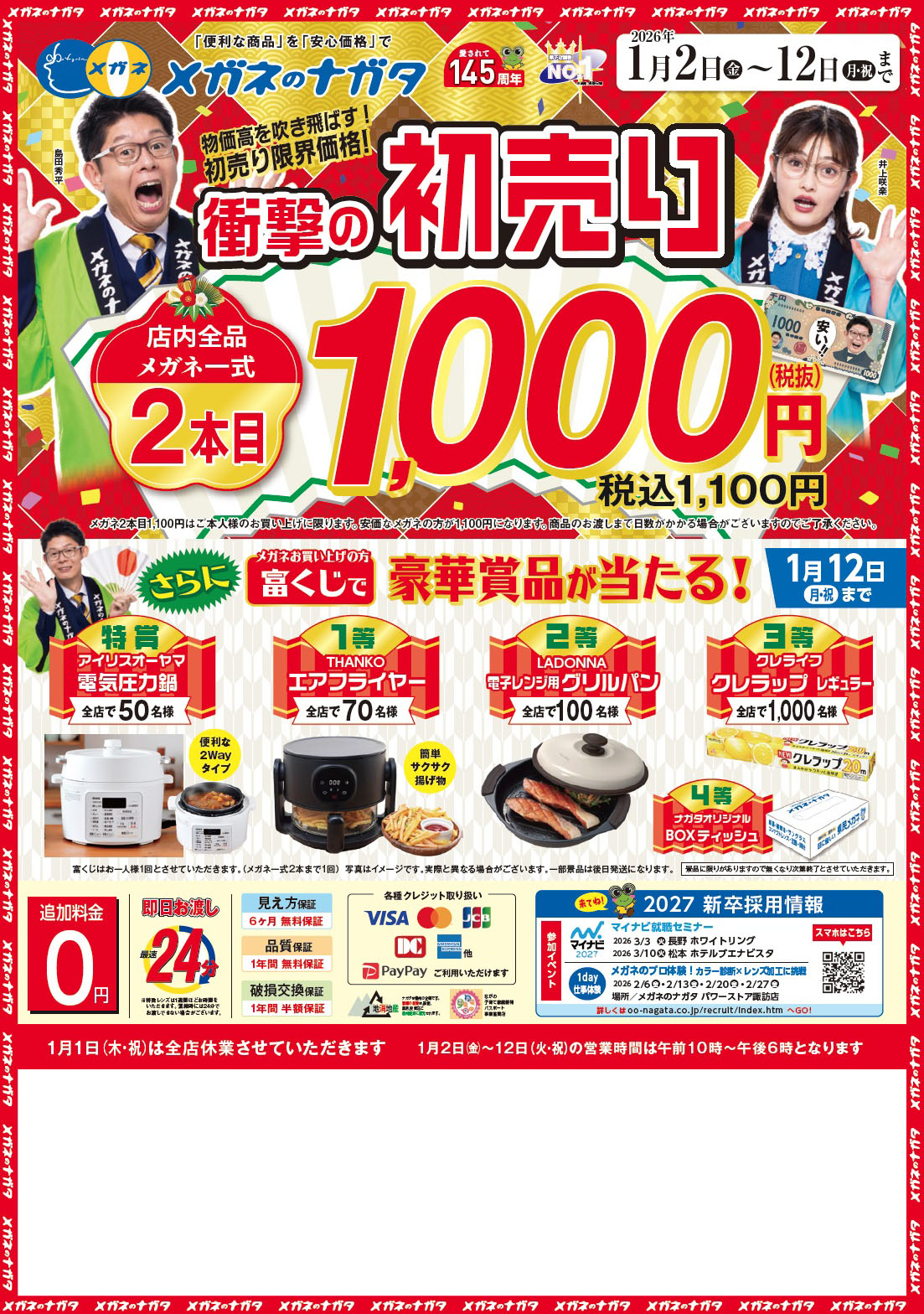衝撃の初売り 店内全品メガネ一式2本目 1000円